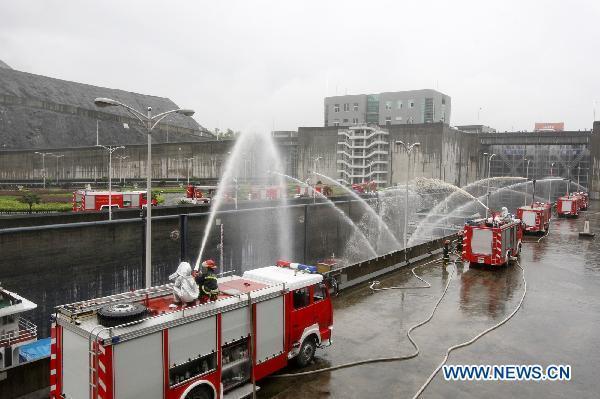 Fire engines spay water to vessels locked in the Three Gorges Dam during a fire drill in Yichang, central China's Hubei Province, Aug. 26, 2010. Some 200 staff members from local public service departments joined in the drill Thursday. (Xinhua/Fang Pei)