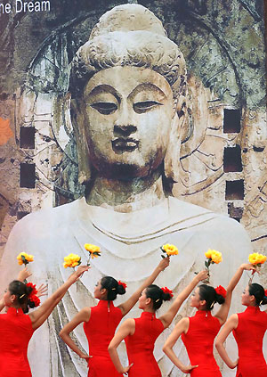 Dancers wave yellow flowers in front of a Buddha statue at the opening ceremony of the Olympic torch relay in Luoyang, Henan Province, July 27, 2008. [Xinhua]