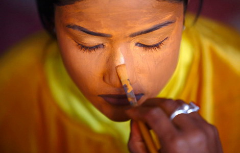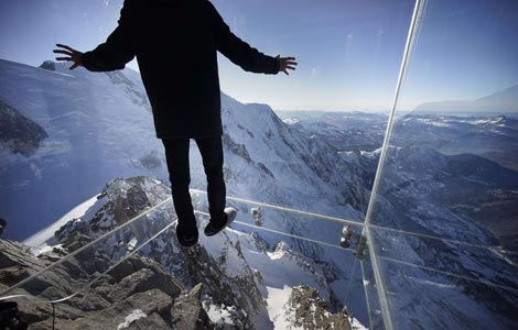 A journalist, wearing slippers to protect the glass floor, stands in the 'Step into the Void' installation during a press visit at the Aiguille du Midi mountain peak above Chamonix, in the French Alps, December 17, 2013. The Chamonix Skywalk is a five-sided glass structure installed on the top terrace of the Aiguille du Midi (3842m), with a 1,000 metre drop below, where visitors can step out from the terrace, giving the visitors the impression of standing in the void. The glass room will open to the public on December 21, 2013. [Photo/Agencies] |